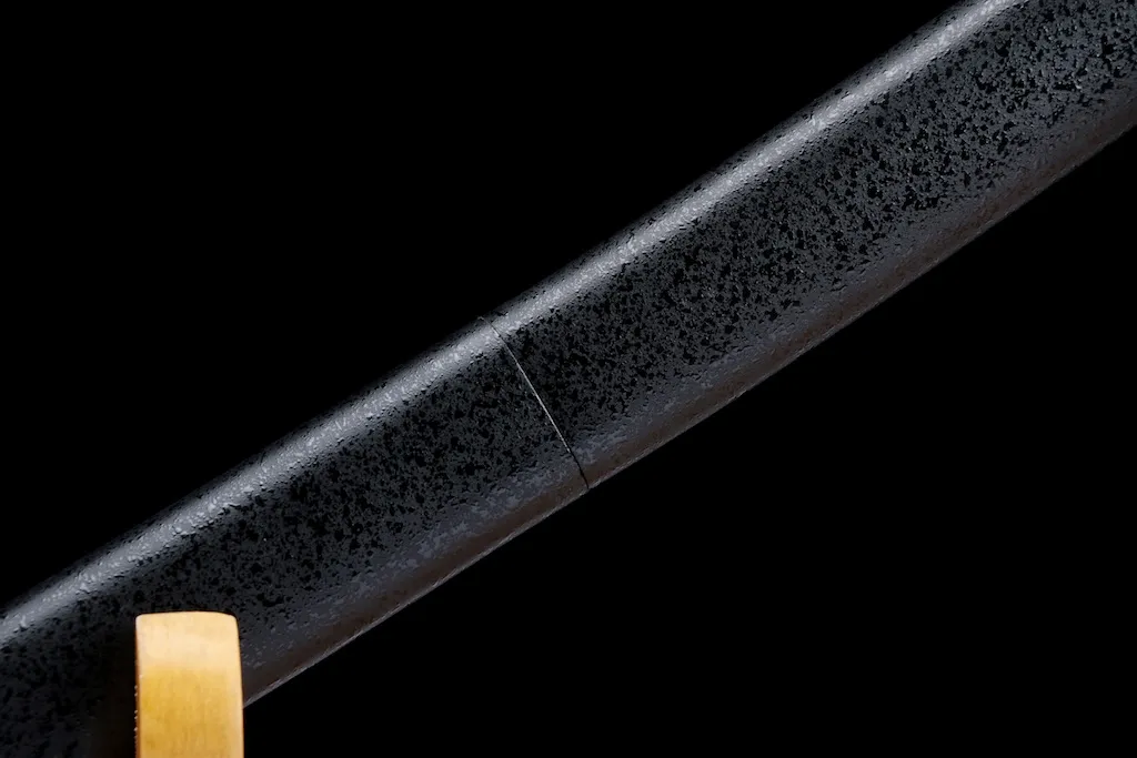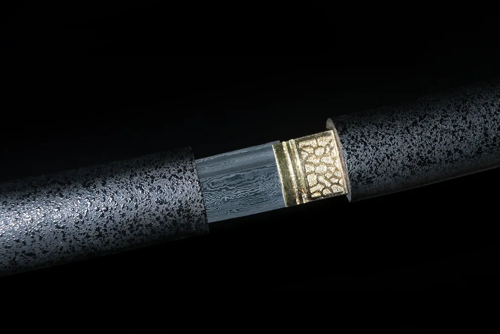 The sword features a full-tang integrated construction, ensuring exceptional durability and resistance to failure under stress. The blade junction is reinforced with stone-textured, gold-plated retention hardware, adding both strength and subtle visual contrast while maintaining a dark, unified appearance.