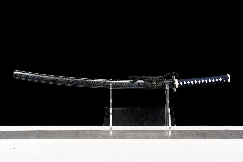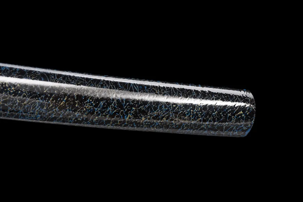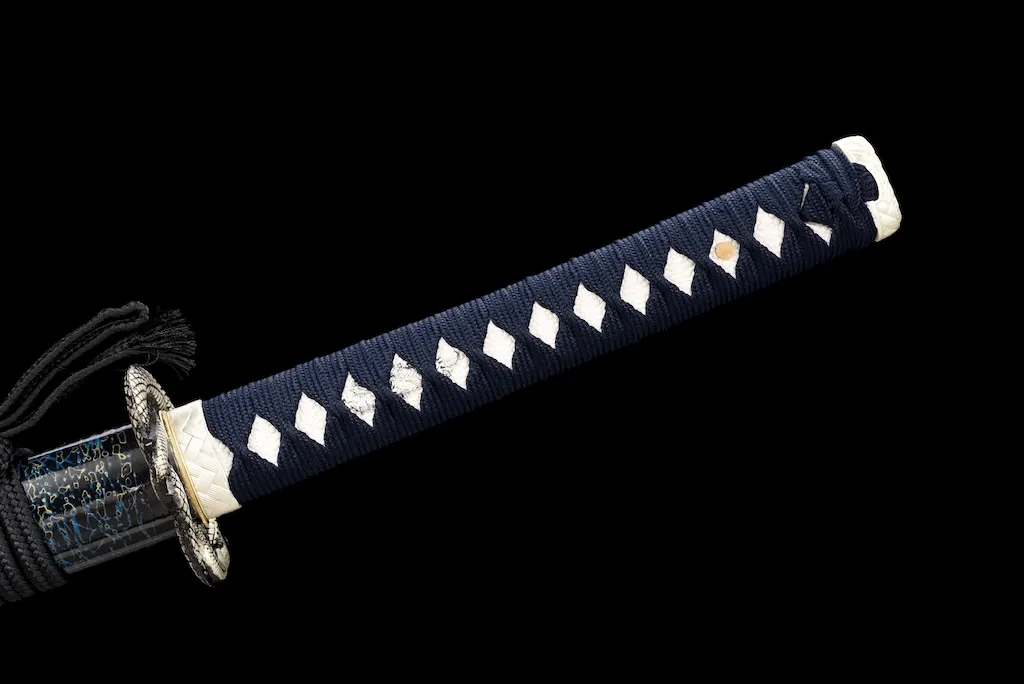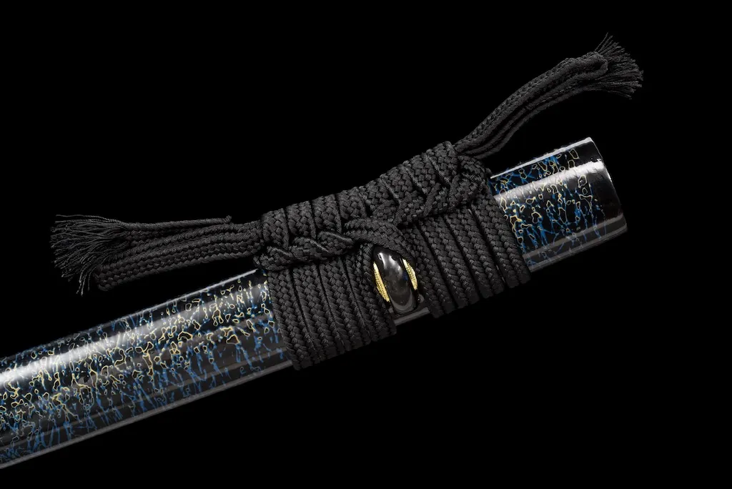 The scabbard is crafted from durable ipe hardwood and finished with an elaborate three-tone water-drop lacquer pattern, adding depth and visual movement. A thick, pure black sageo cord completes the refined yet powerful overall appearance.