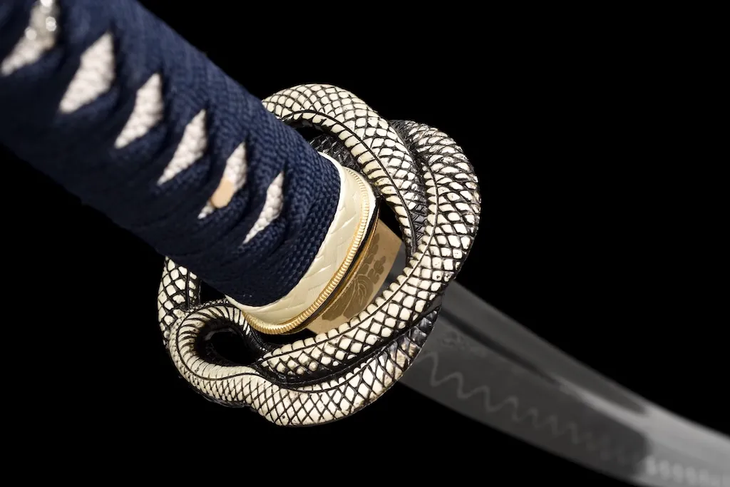 All fittings follow a unified serpent motif. The habaki and seppa are crafted from solid copper with engraved detailing, while the tsuba features a dark, python-inspired design in black and gray tones. Silver-toned snake-scale patterns decorate the handle fittings, reinforcing the sword’s mythological and commanding presence.