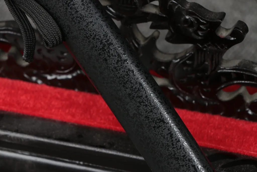 The saya is finished in a black raindrop lacquer pattern, offering scratch resistance and understated elegance. The handle core is made from natural hardwood and wrapped with cord to ensure a secure and comfortable grip.