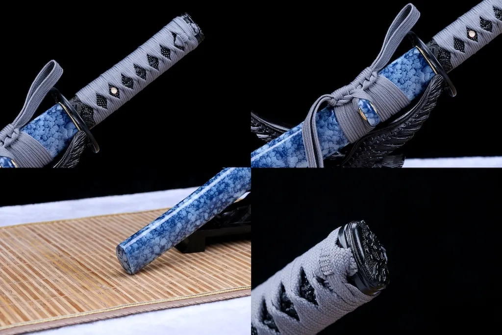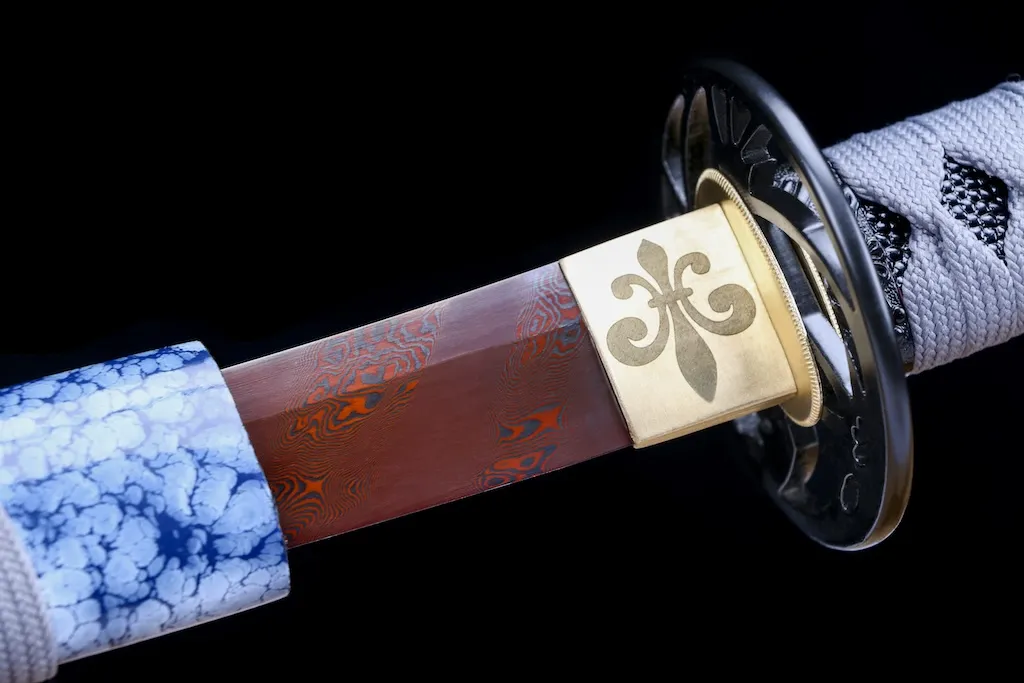 The tsuba is crafted from solid iron with an openwork design, offering excellent strength and a traditional, rugged appearance that complements the blade’s bold character.