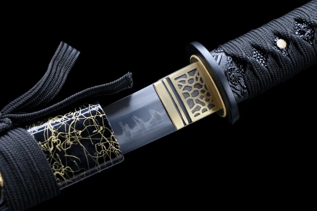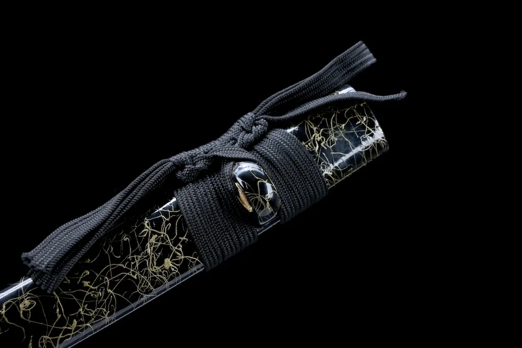 The saya is crafted from natural hardwood and finished with a hairline-style coating, giving it a subtle metallic texture that resists visible scratches and wear.