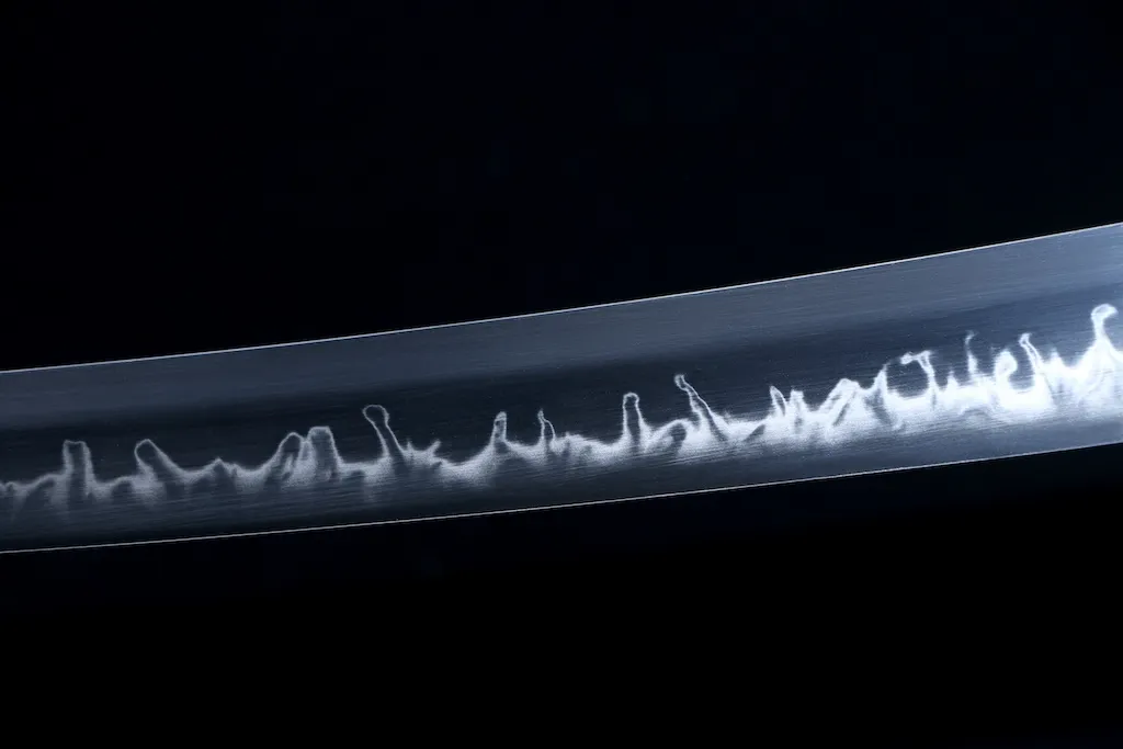 Using a traditional clay tempering process, a flowing Gunome hamon—characterized by continuous wave-like curves—emerges along the edge.